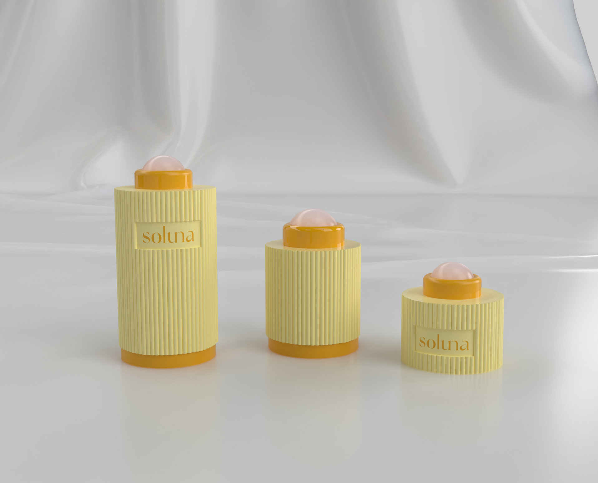 The final bottle showcases the wordmark applied to a clean, modern form, highlighting the brand’s identity. Its 2-in-1 design features dual roll-on applicators, one tailored for precise application on the face and the other for broader coverage on the body.